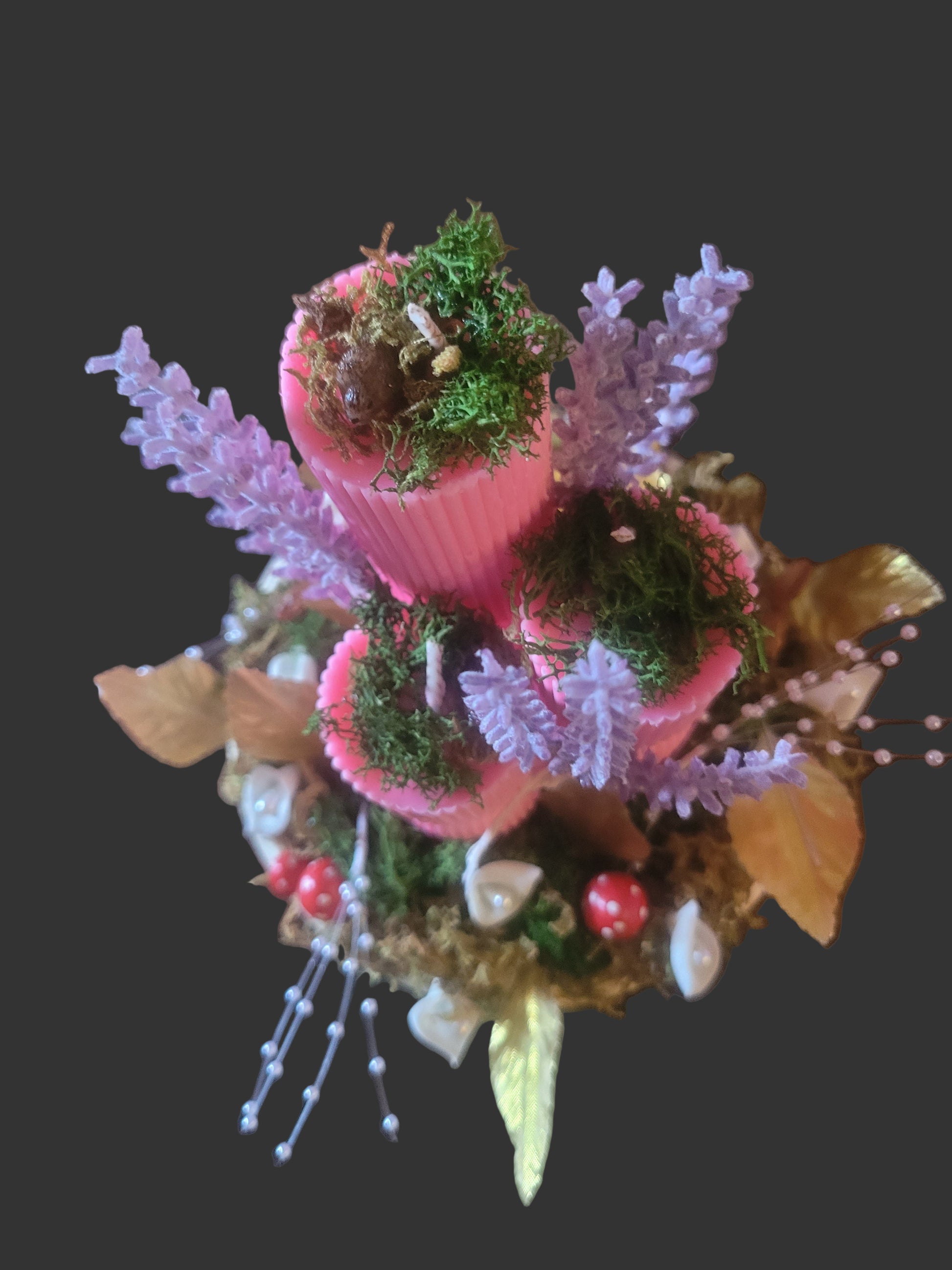 Add a touch of handmade charm to your dining table with this one-of-a-kind Table Centerpiece! Crafted with love and care entirely by hand, this unique piece features four pink ribbed scented candles stacked in a whimsical arrangement, surrounded by delicate lavender sprigs, moss, golden leaves, white petals, and adorable red mushrooms with pearly accents.